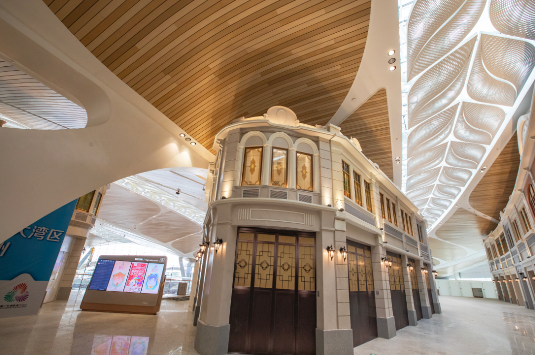 最让人眼前一亮的,是这里的“新”与“旧”、“东”与“西”撞出的火花。灵活的快闪店,今天可能是新品首发,明天或许是主题活动,每次来都能撞见新鲜事,像拆盲盒一样有期待。而最让人挪不开眼的,要数东、西侧五层的骑楼商业街——青灰色的砖、弯弯的拱廊,窗楣上刻着广州特有的花纹,连檐口的山花造型都复刻得一模一样,站在这里,仿佛瞬间走进了西关的老巷。行人走在拱廊下,晒不到太阳也淋不到雨,敞阔的廊道里,偶尔还能看到临时市集,烟火气一下子就浓了。只是细细看,又会发现不一样:青砖旁边是锃亮的金属框架,传统灰塑混搭着现代技术,老骑楼的“魂”还在,却多了机场的现代范儿,像一位穿着新衣裳的老人,讲着过去的故事,也说着现在的新鲜事。