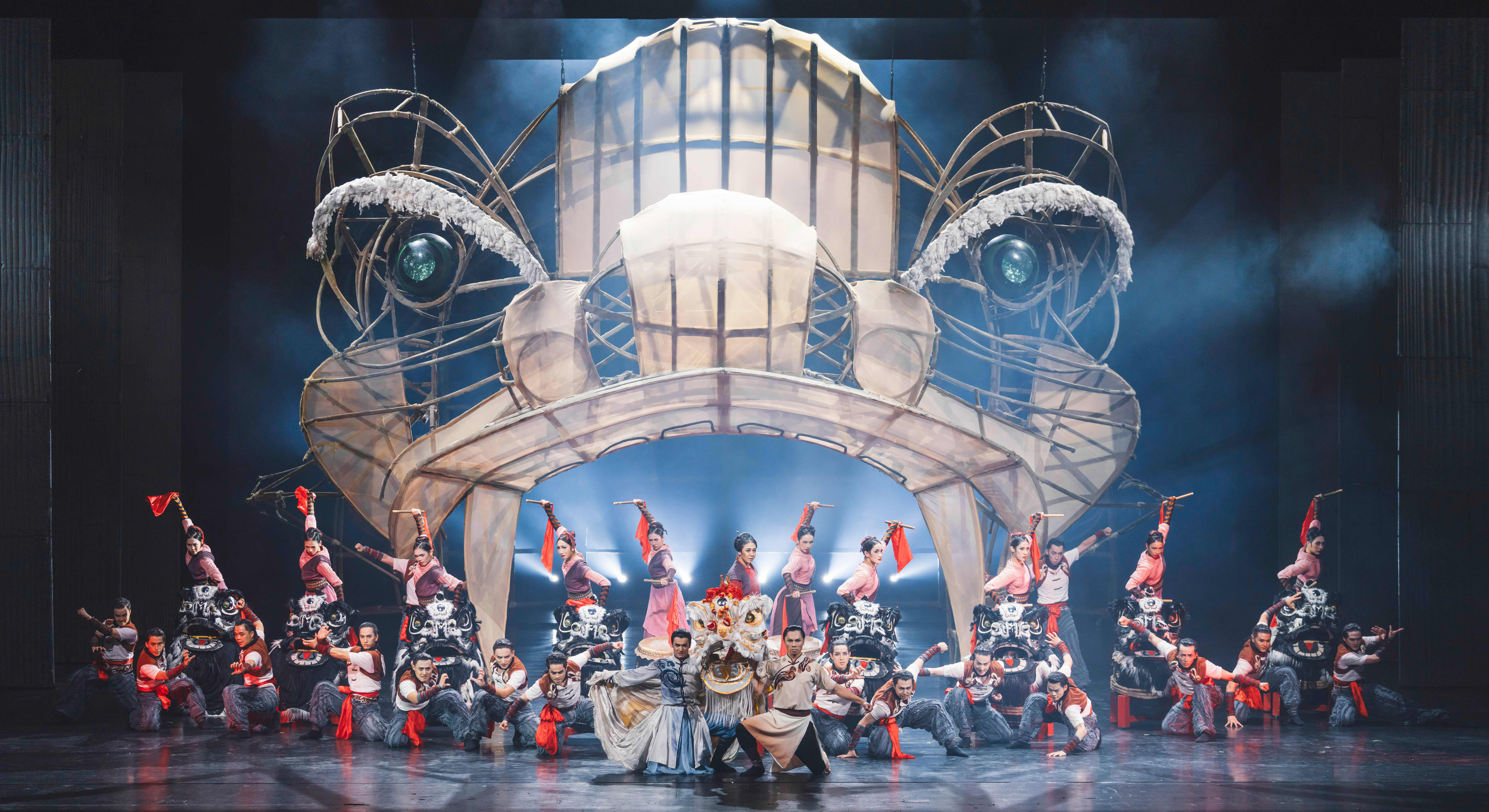 它既是岭南人节庆生活的精神符号,也是海外华人认祖归宗的文化桥梁。艺术总监、总导演史前进,制作人林凯彬、总编导钱鑫、王思思,编剧罗丽等组成的主创团队历时5年采风,足迹遍布三元里村、陈家祠、佛山祖庙,将南拳马步的刚劲、醒狮腾挪扑跃的灵动与民族舞蹈的抒情特质相融合,创造出“狮形舞韵”的独特语汇——演员无需佩戴完整狮头,仅通过肢体张力与道具“龙骨”的虚实结合,便将醒狮的威风与灵性展现得淋漓尽致。